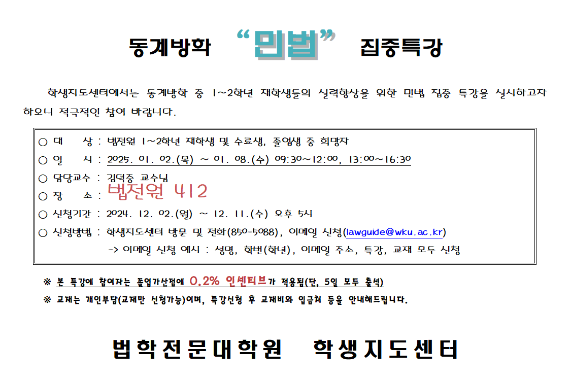 공지사항 홈공지사항 [장소 정정] 2024학년도 2학기 동계방학 법학전문대학원 “민법” 집중 특강 공지 [장소 정정] 2024학년도 2학기 동계방학 법학전문대학원 “민법” 집중 특강 공지 학생지도센터2024-12-31 페이스북 트위터 구글플러스 이메일 프린트 이전공지사항다음