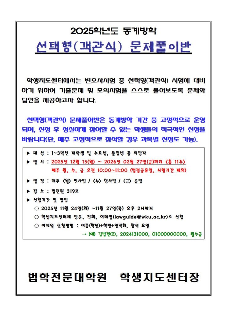 공지사항 홈공지사항공지사항 2025학년도 동계방학 선택형[객관식] 문제풀이반 운영 공고 2025학년도 동계방학 선택형[객관식] 문제풀이반 운영 공고 학생지도센터2025-11-24 페이스북 트위터 구글플러스 이메일 프린트 이전공지사항다음