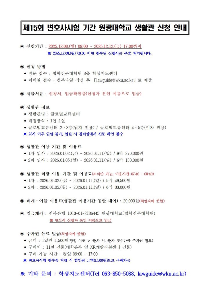 | 2026년 제15회 변호사시험 기간 원광대학교 생활관 신청 안내 | |