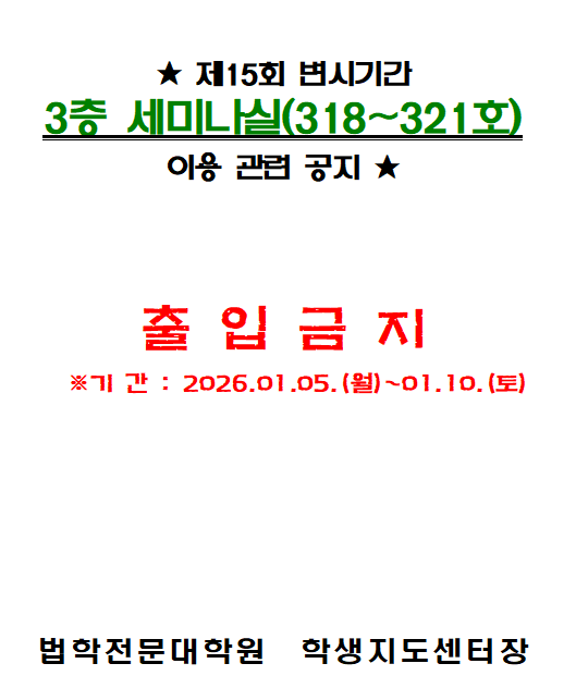 공지사항 홈공지사항공지사항 제15회 변시기간 3층 세미나실(318~321호)이용 관련 공지 제15회 변시기간 3층 세미나실(318~321호)이용 관련 공지 학생지도센터2025-12-19 페이스북 트위터 구글플러스 이메일 프린트 이전공지사항다음