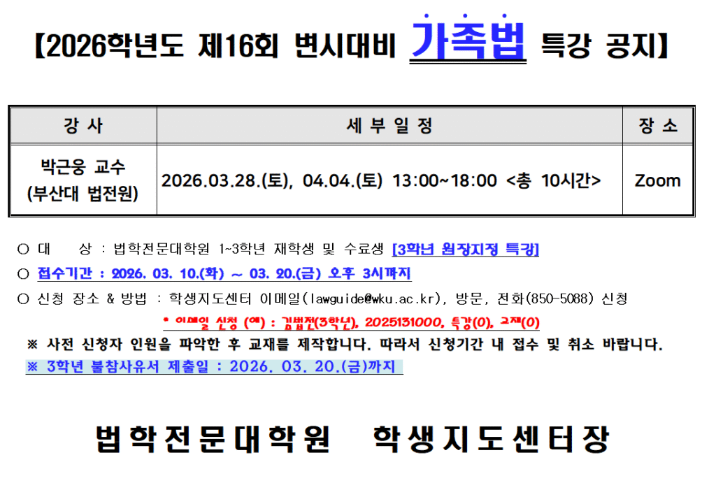 공지사항 홈공지사항공지사항 2026학년도 제16회 변시대비 가족법 특강 공지 2026학년도 제16회 변시대비 가족법 특강 공지 학생지도센터2026-03-10 페이스북 트위터 구글플러스 이메일 프린트 이전공지사항다음